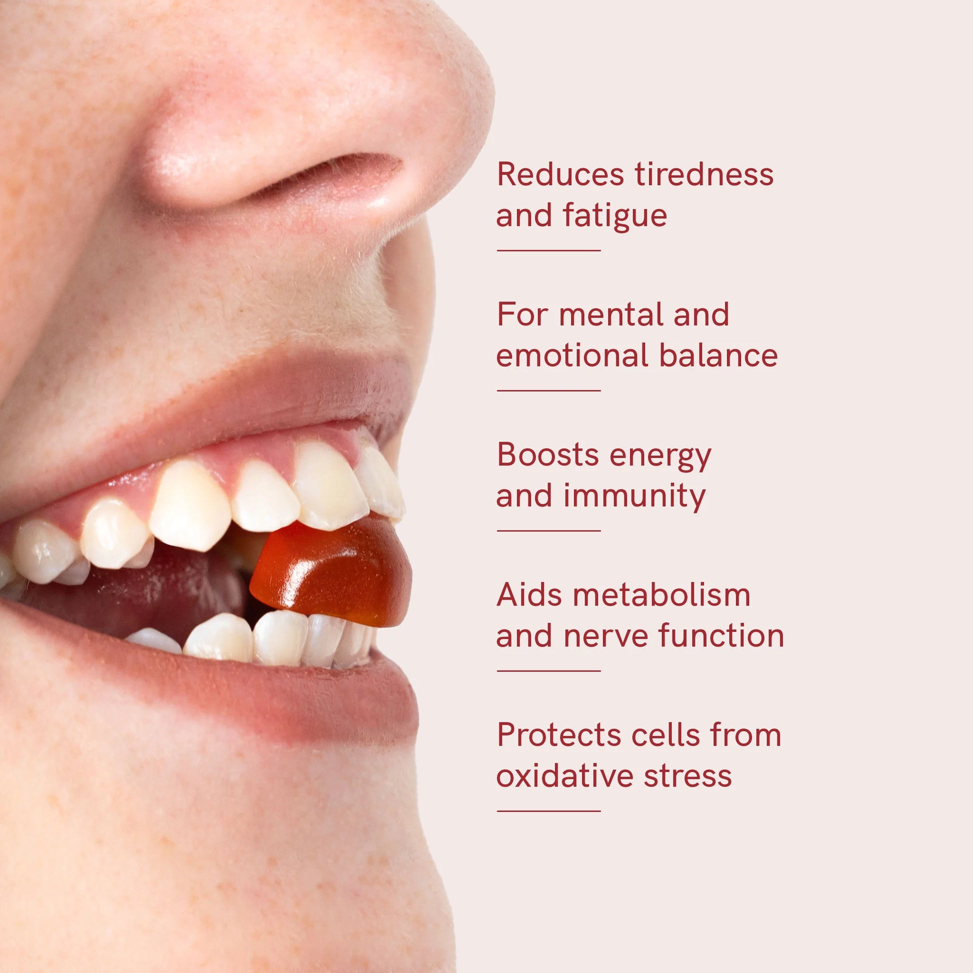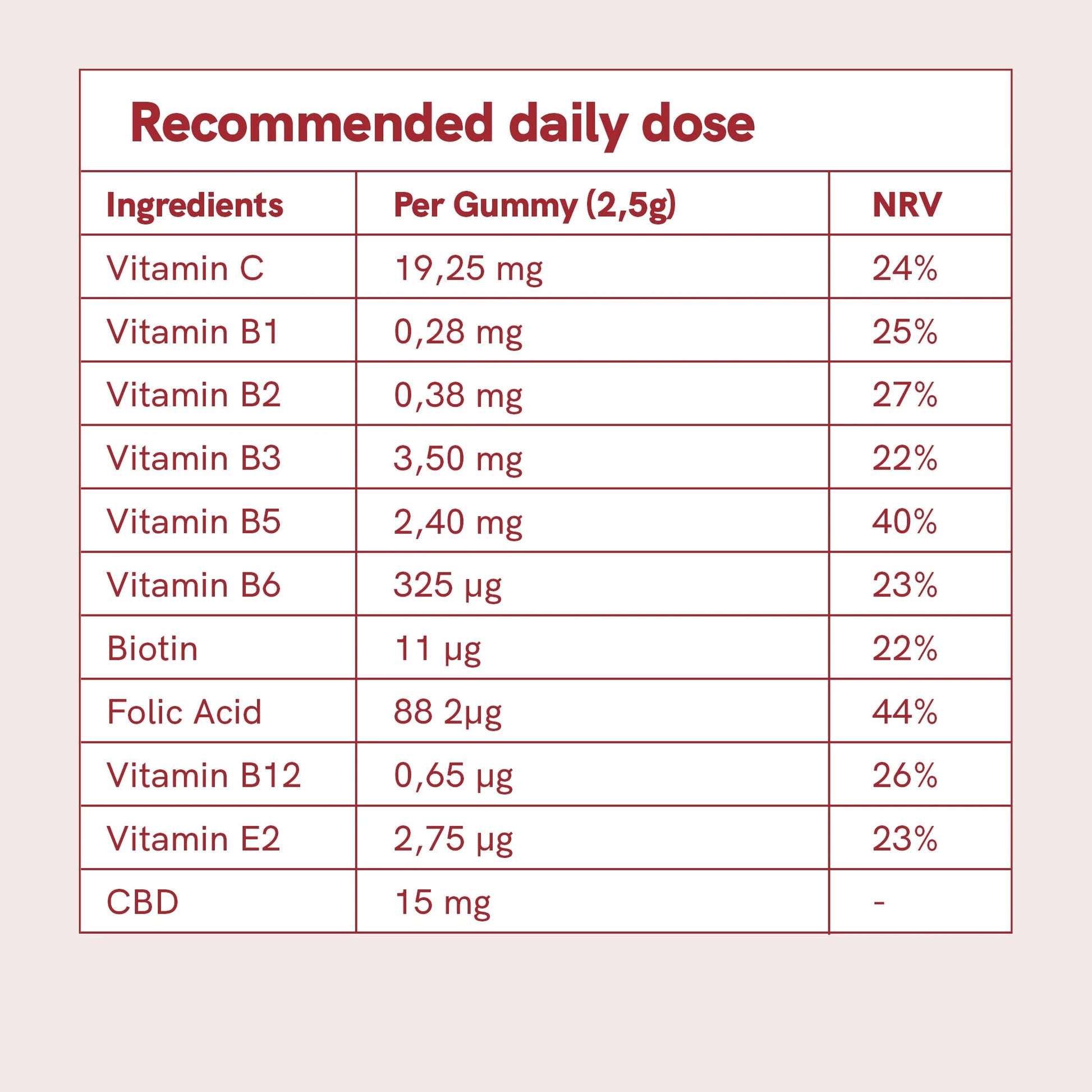 | Nutrient | Per gummy (≈2.5 g) | %NRV* |