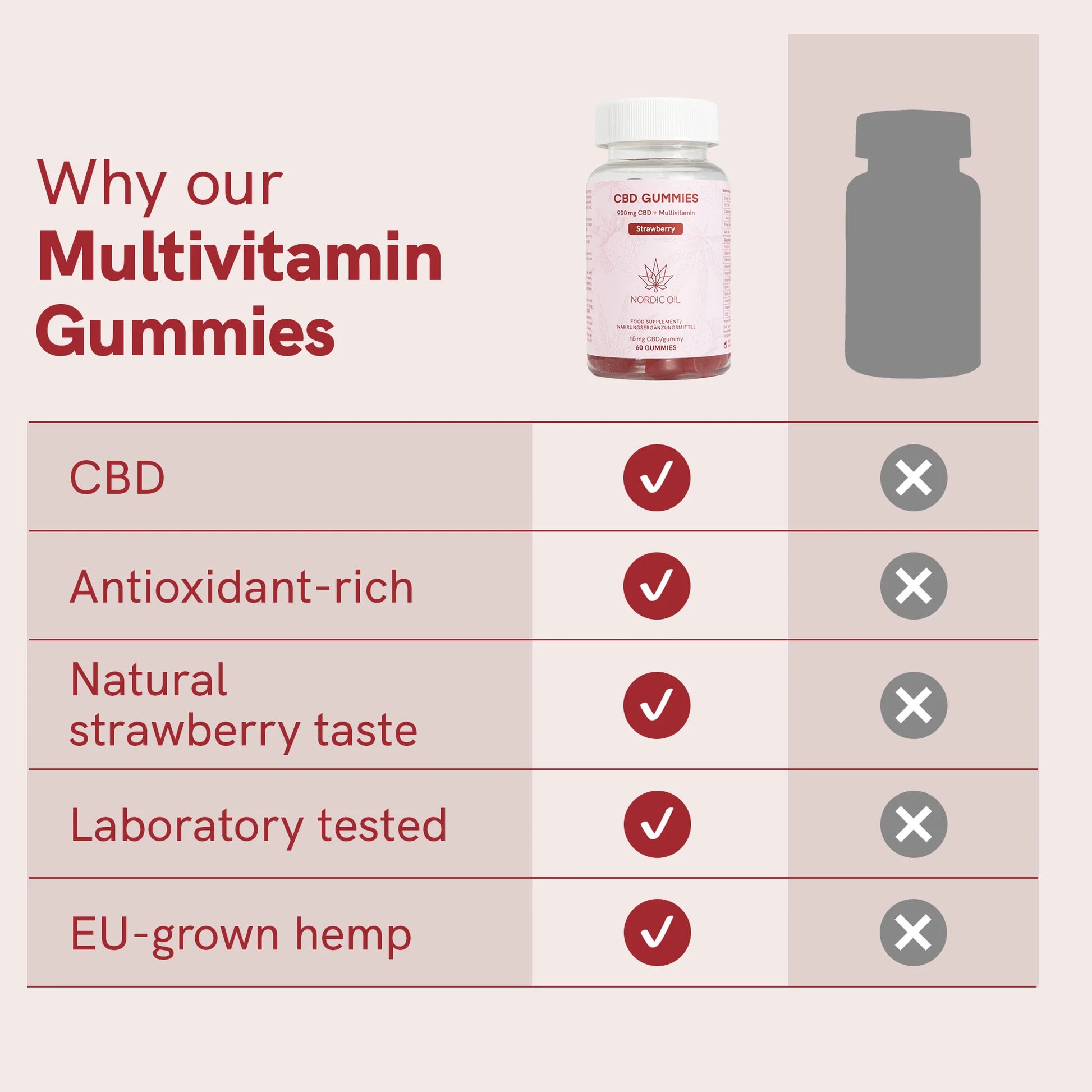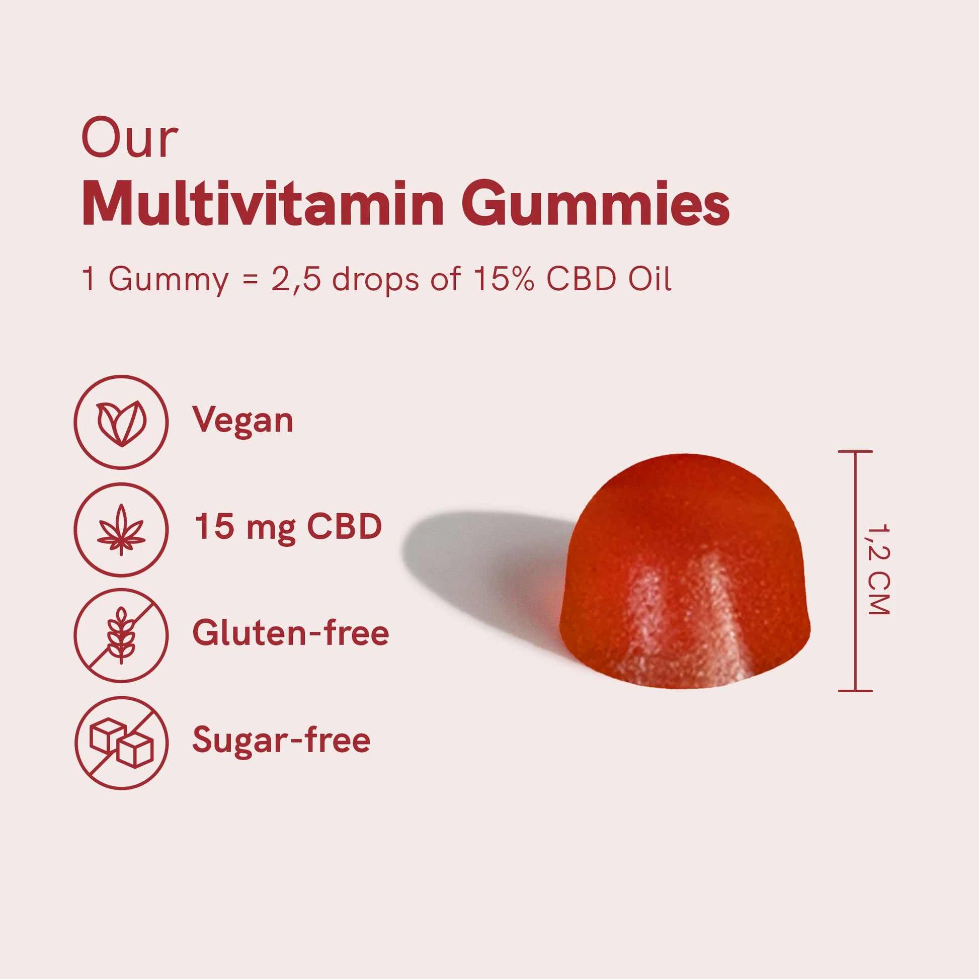 Our new CBD gummies with multivitamin are both delicious and ideal for on the go. Each gummy is packed with15mg CBD and essential vitamins. To top it all off, our gummies taste like fresh strawberries.