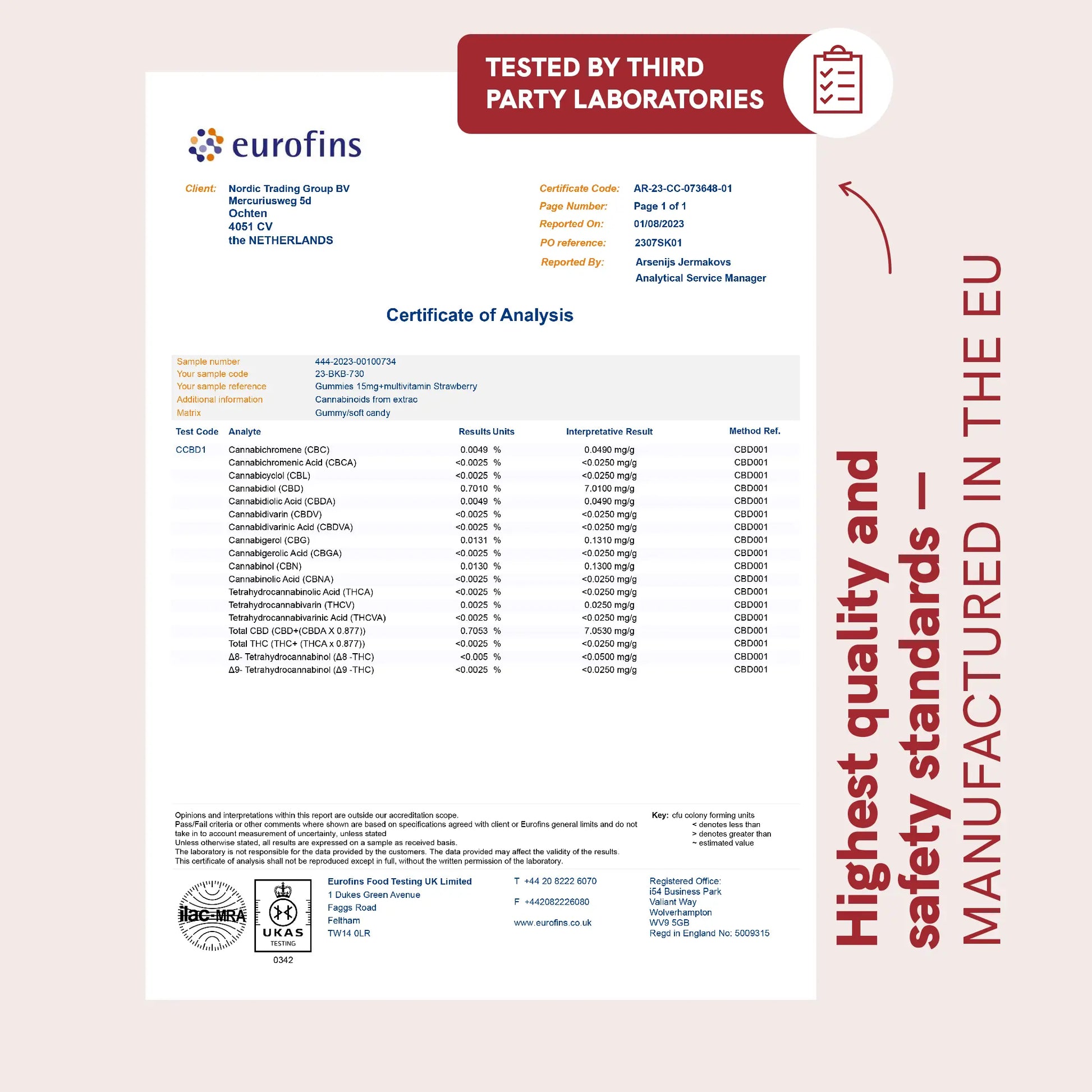 Maltitol syrup, maltitol, water, vitamins (vitamin E, vitamin B1, vitamin B2, vitamin B3, vitamin B5, vitamin B6, vitamin B12, vitamin C, folic acid, biotin), pectin, citric acid, potassium sodium tartrate, concentrate (sweet potato, carrot), hemp extract, natural strawberry flavor, sodium citrate, natural flavors, carnauba wax, maltodextrin.