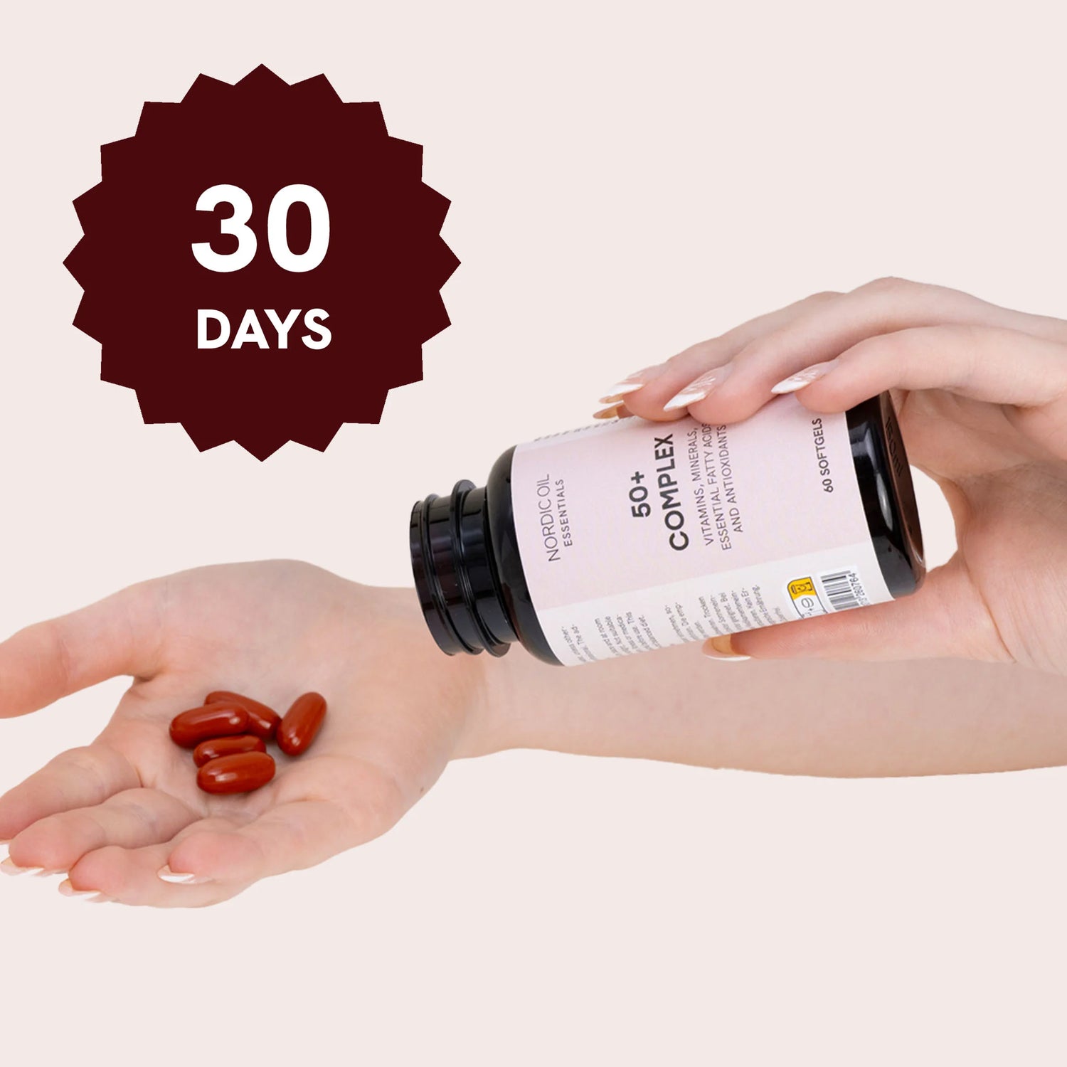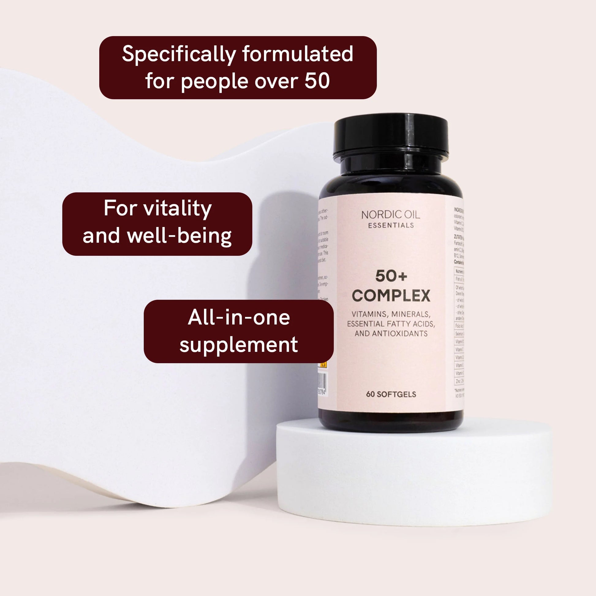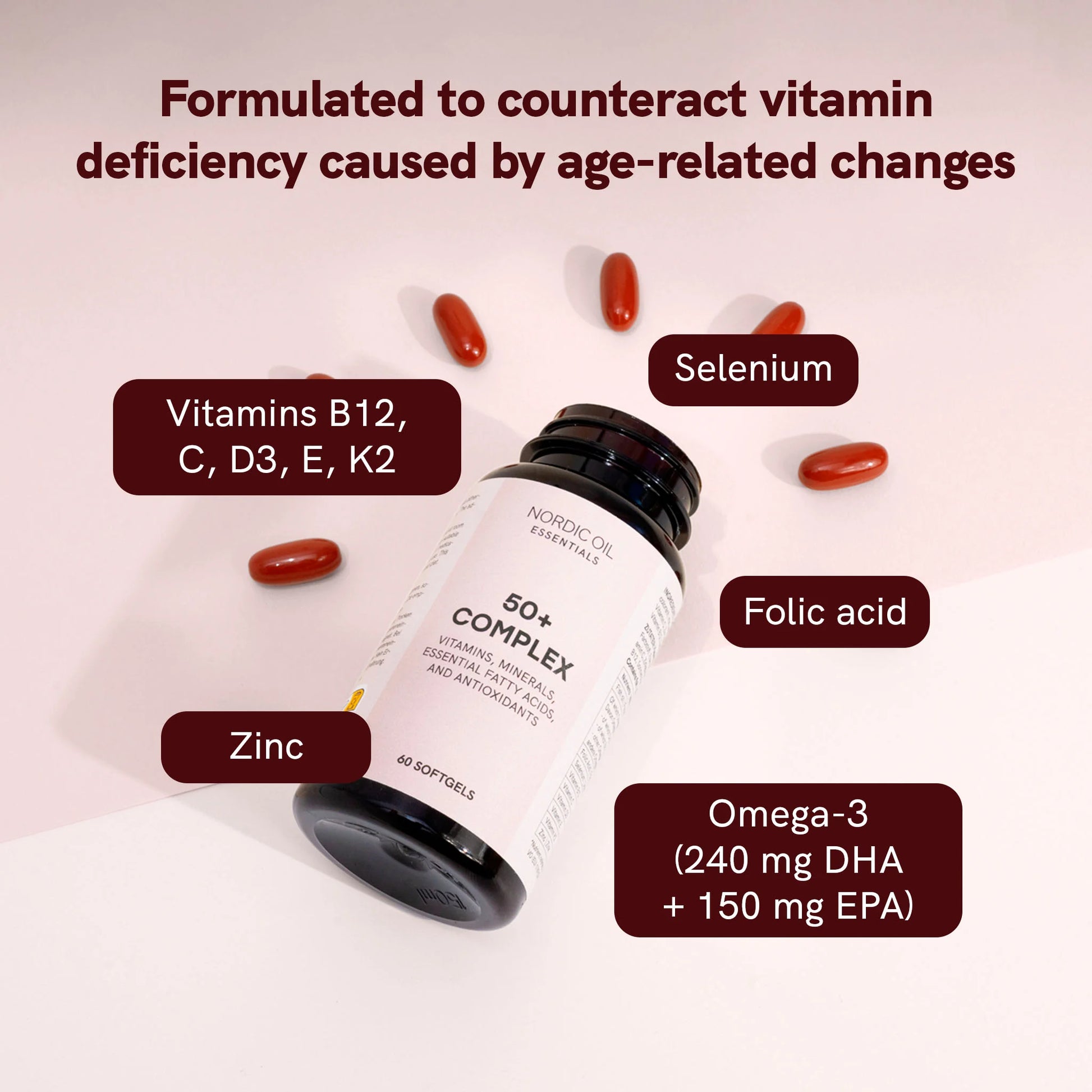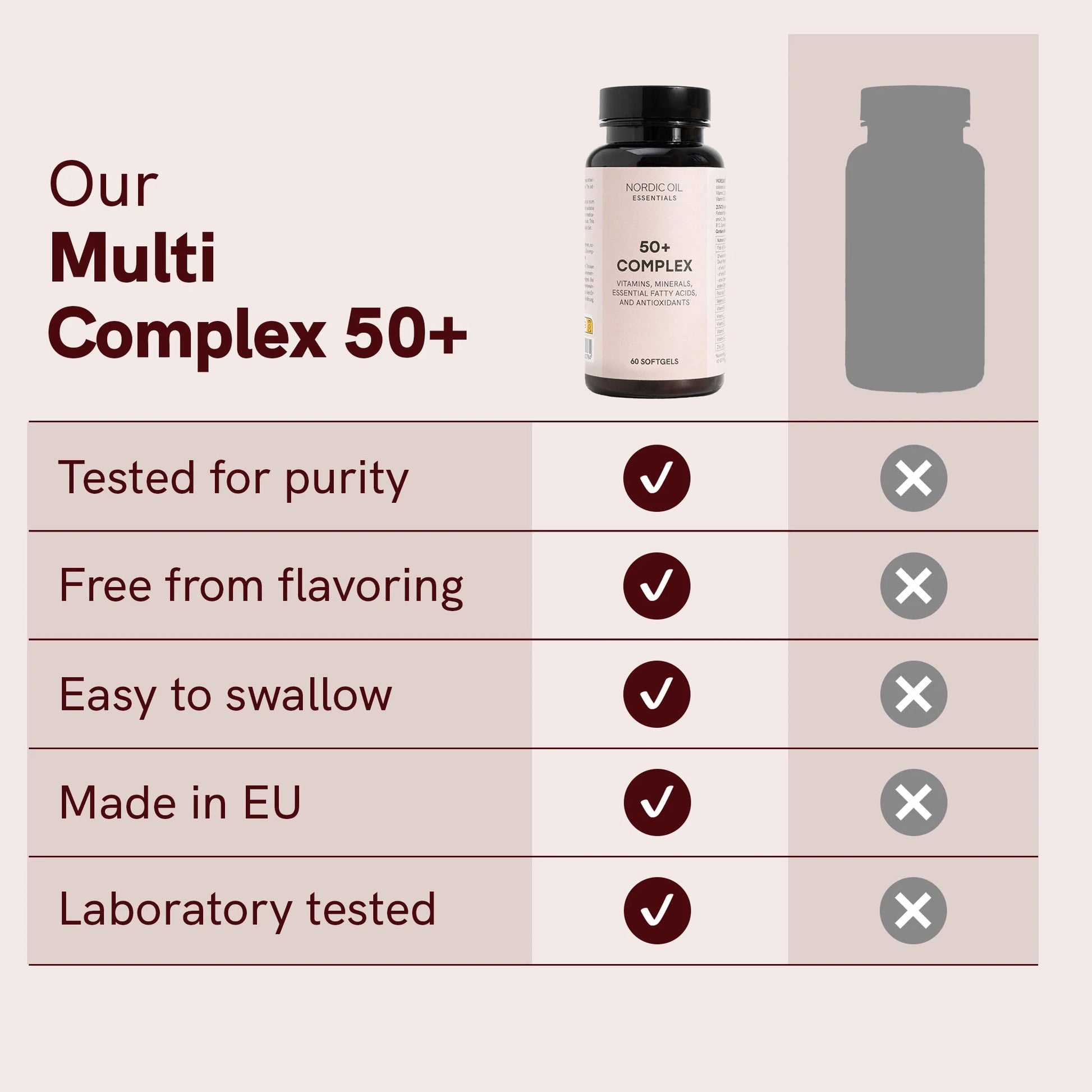 Multi Complex 50+ goes beyond the typical multivitamin. As well as containing a broad spectrum of vitamins and minerals, it also contains omega-3 fatty acids (DHA and EPA), which are rarely found in conventional supplements. Furthermore, it is tailored to the needs of adults aged 50 and over, making it a more appropriate choice for older adults than conventional multivitamins.