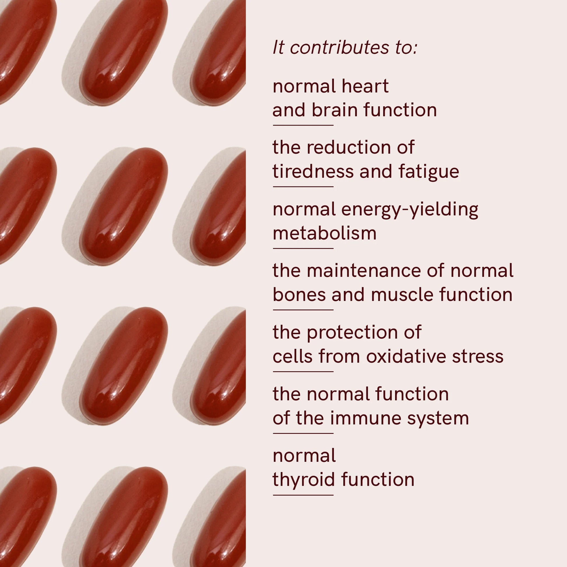 Softgel contains: Fish oil, MCT oil, Vitamin C, Zinc gluconate, Beeswax, Selenium yeast, Tocopherol, Vitamin B12, Sunflower lecithin, Vitamin K2, Vitamin D3, Folic acid.