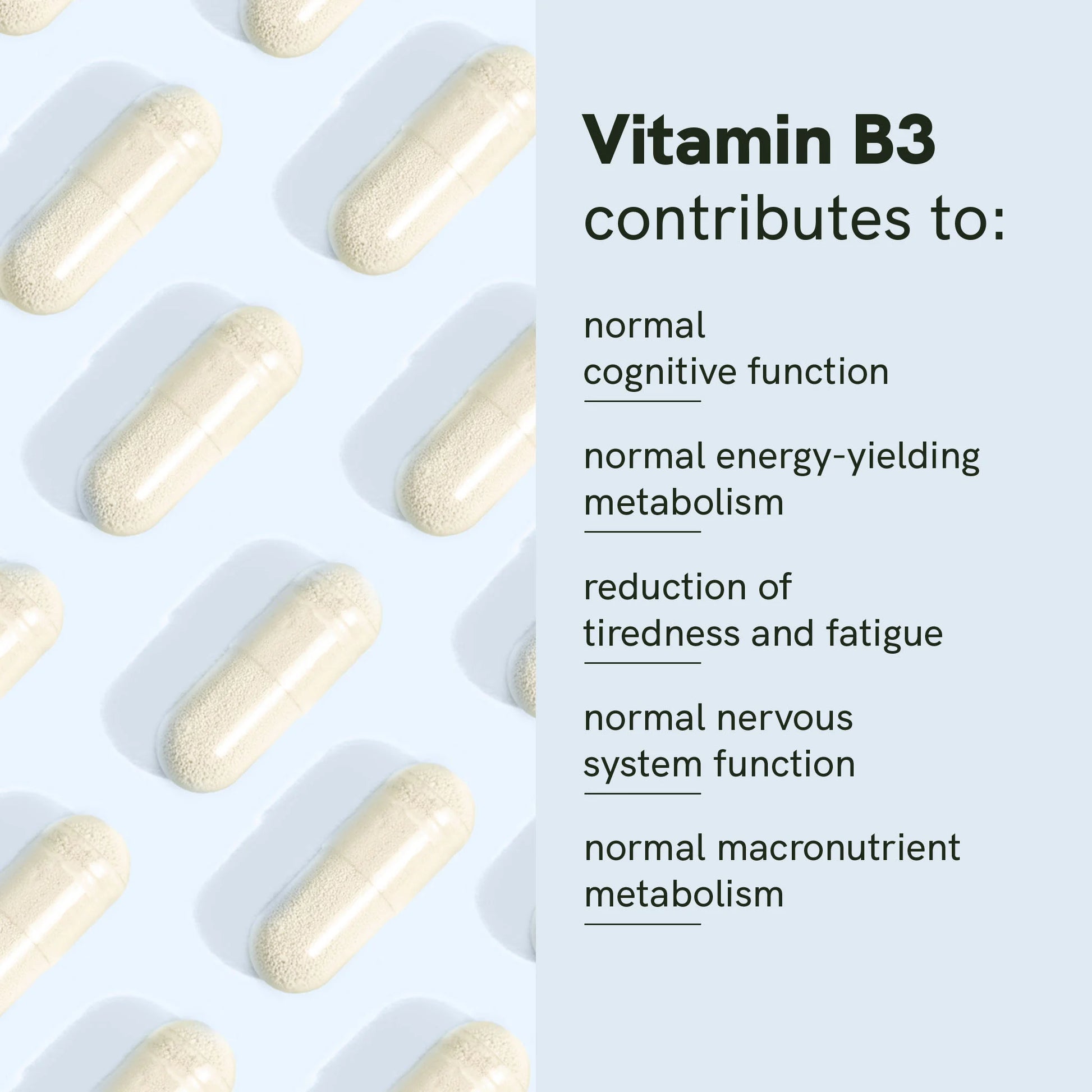 Vitamin B3 (nicotinamide) contributes to normal psychological function and helps reduce tiredness and fatigue. It also supports the normal function of the nervous system.