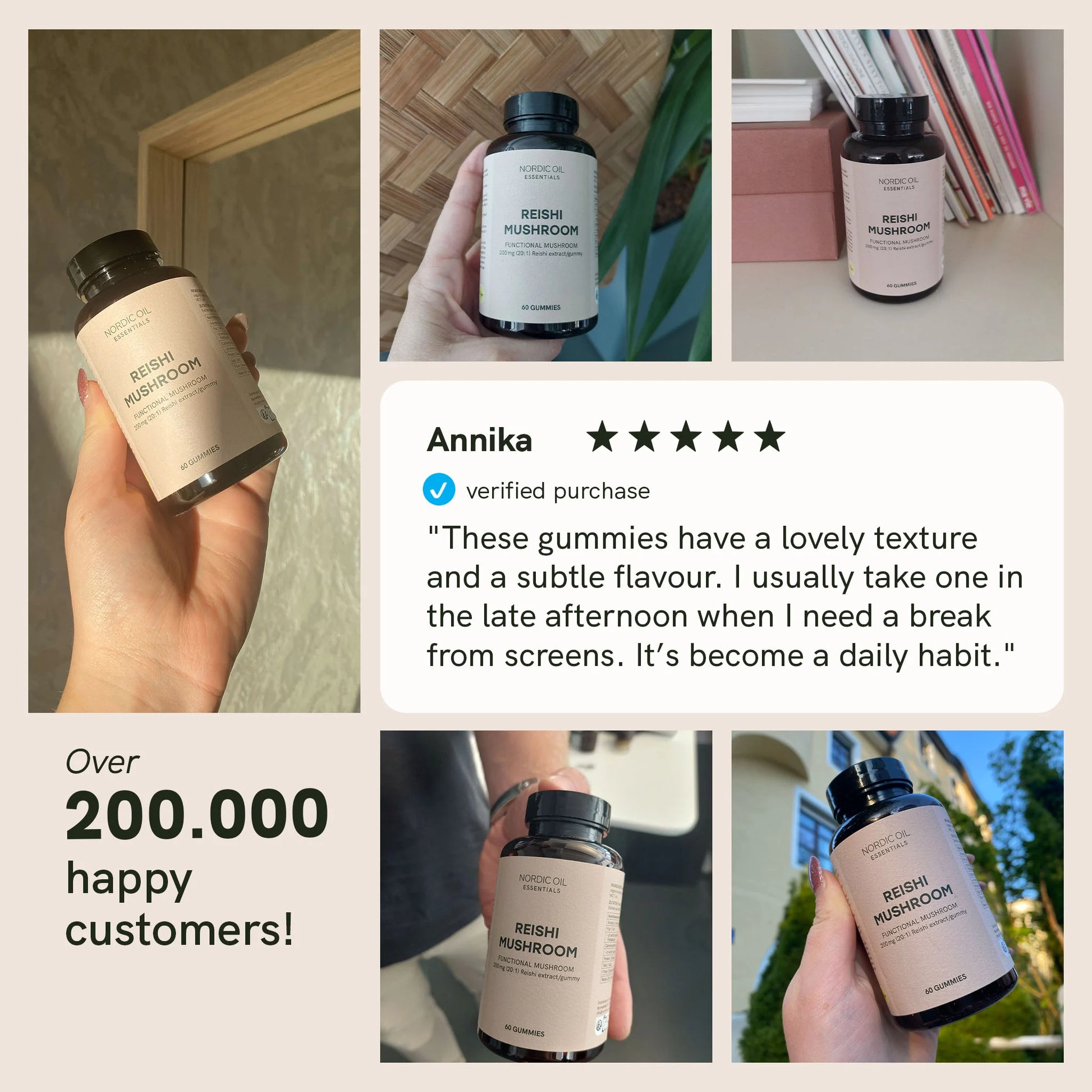 Reishi Gummies are a simple and delicious way to enjoy the potential benefits of Reishi mushrooms, one of the most revered adaptogens in traditional medicine. Each bottle contains 60 vegan, gluten-free, and sugar-free gummies, thoughtfully crafted in the EU to meet high-quality standards.