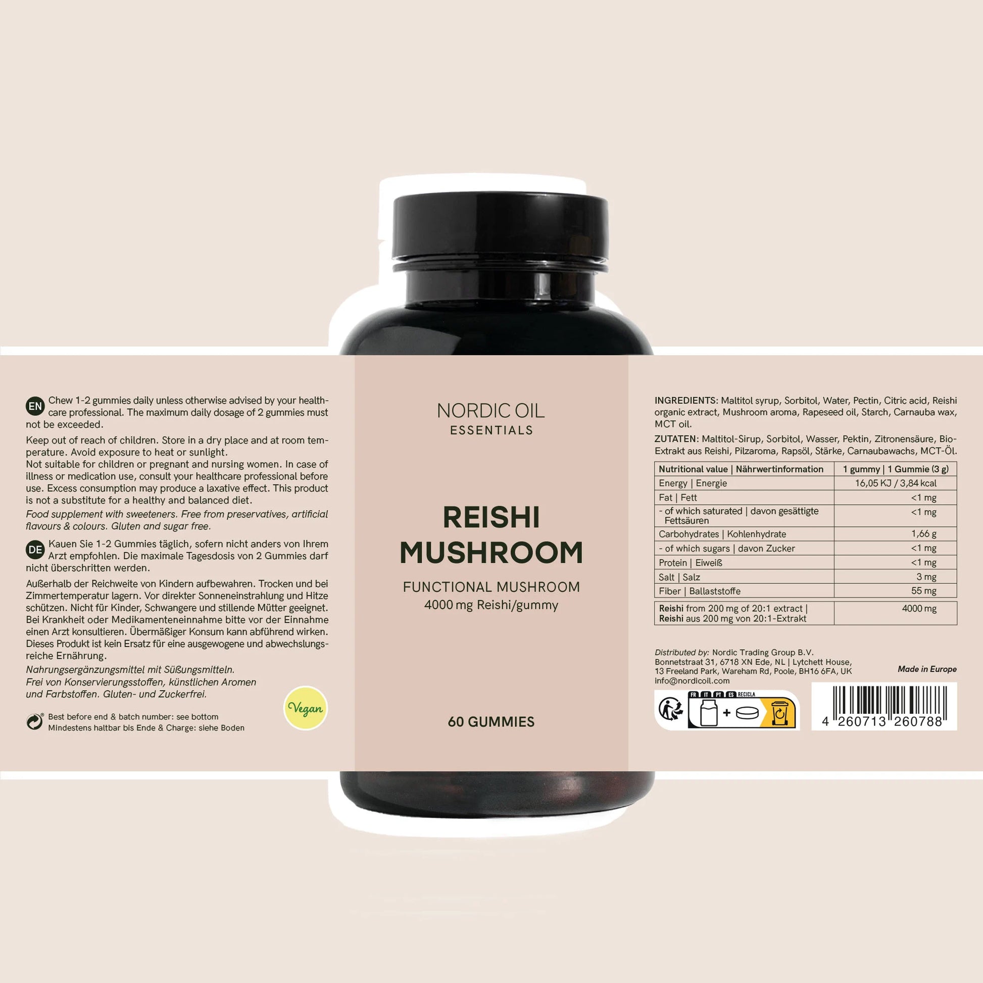 Maltitol syrup, Sorbitol, Water, Pectin, Citric acid, Reishi organic extract, Mushrooms aroma, Rapeseed oil, Starch, Carnauba wax, MCT oil.