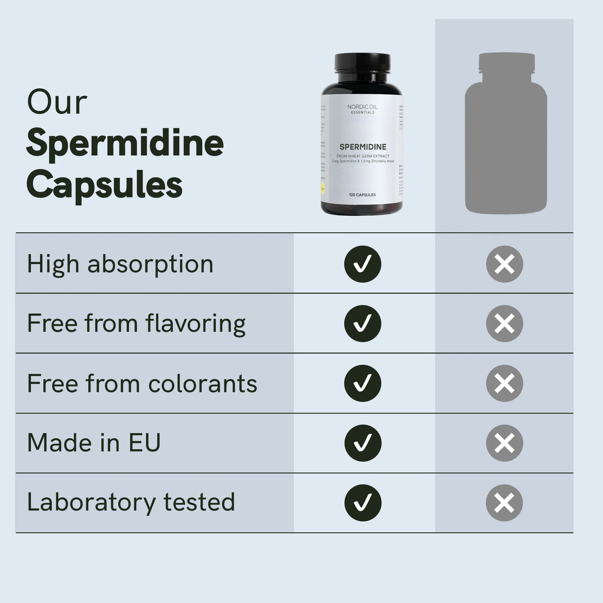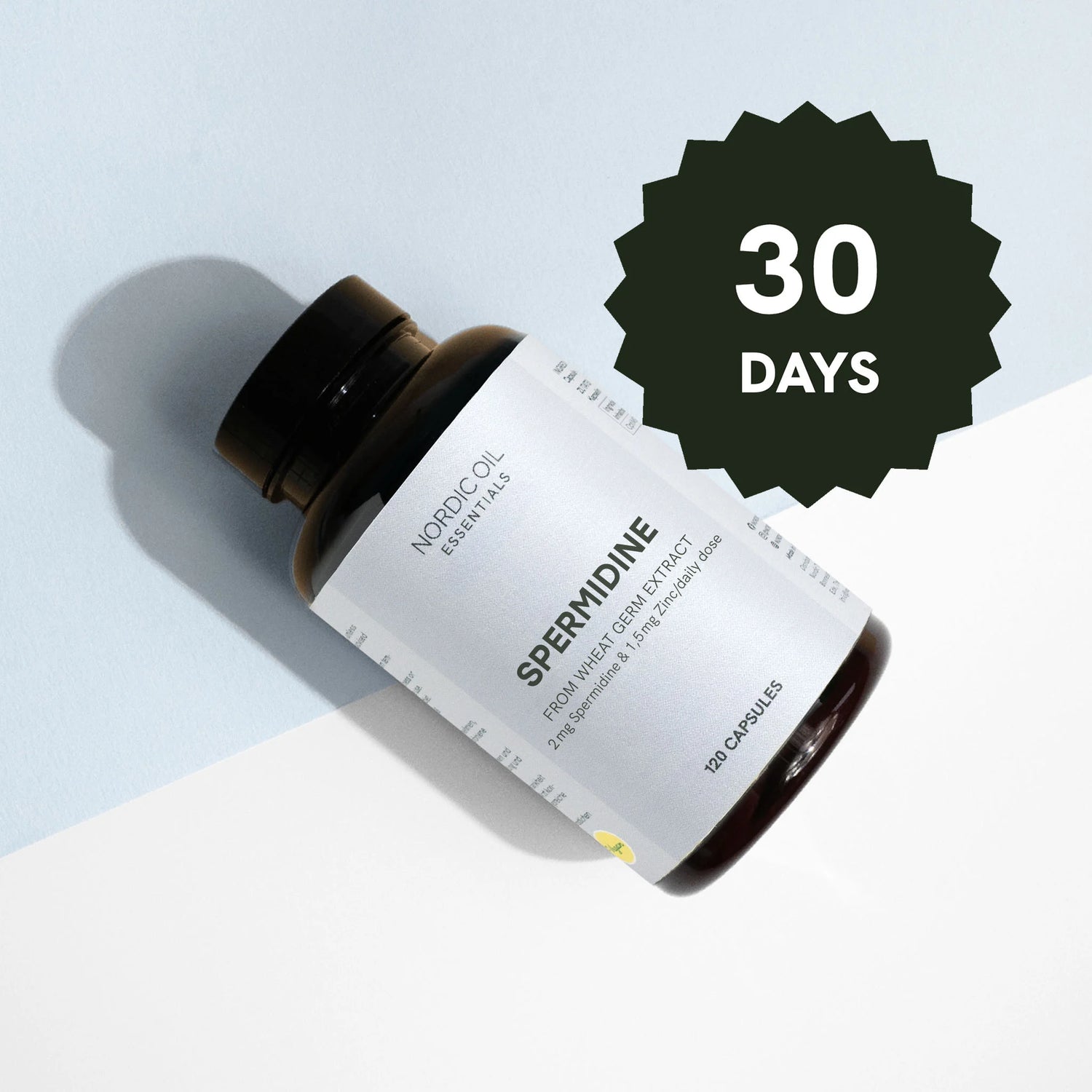 Spermidine Capsules form Nordic Oil are formulated using spermidine-rich wheat germ extract, providing up to 6 mg of spermidine and up to 4,5 mg of zinc in a full daily dose of six capsules. Naturally found in all cells, spermidine is a polyamine that plays an important role in cellular growth, renewal, and in supporting both DNA stability and RNA activity. Together, these functions are connected to healthy aging.