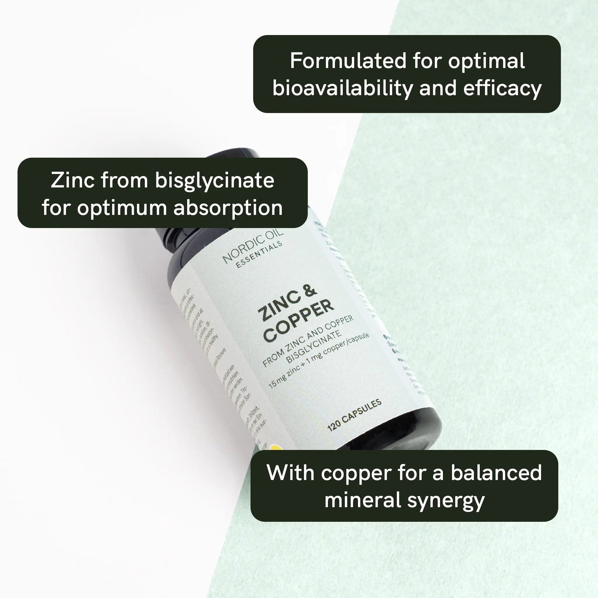 Our zinc capsules, enriched with copper provide a balanced combination of 15 mg of elemental zinc and 1 mg of elemental copper per capsule. Sourced from zinc bisglycinate and copper bisglycinate, these minerals are highly bioavailable, ensuring optimal absorption and effectiveness.
